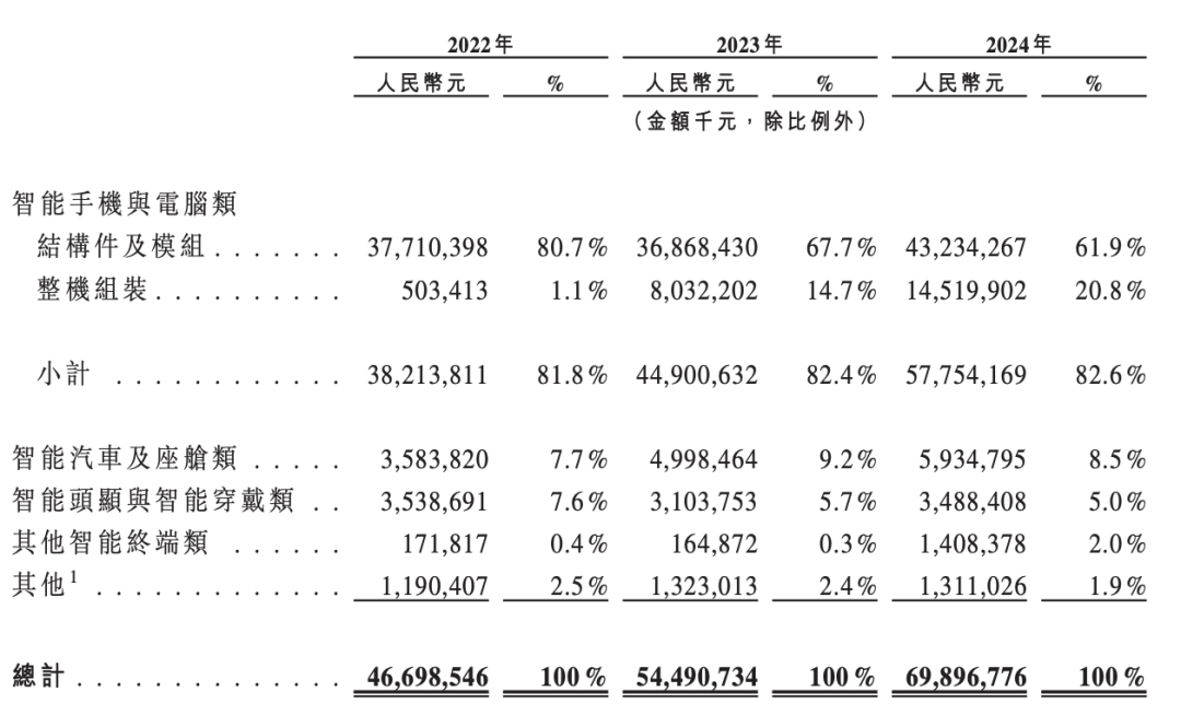 在业绩记录期间,蓝思科技的收入主要来自提供各类智能终端精密制造解决方案,包括智能手机及计算机类、智能汽车及座舱类、智能头显与智能穿戴类及其他智能终端类。这些解决方案包括结构件、模块和整机组装。