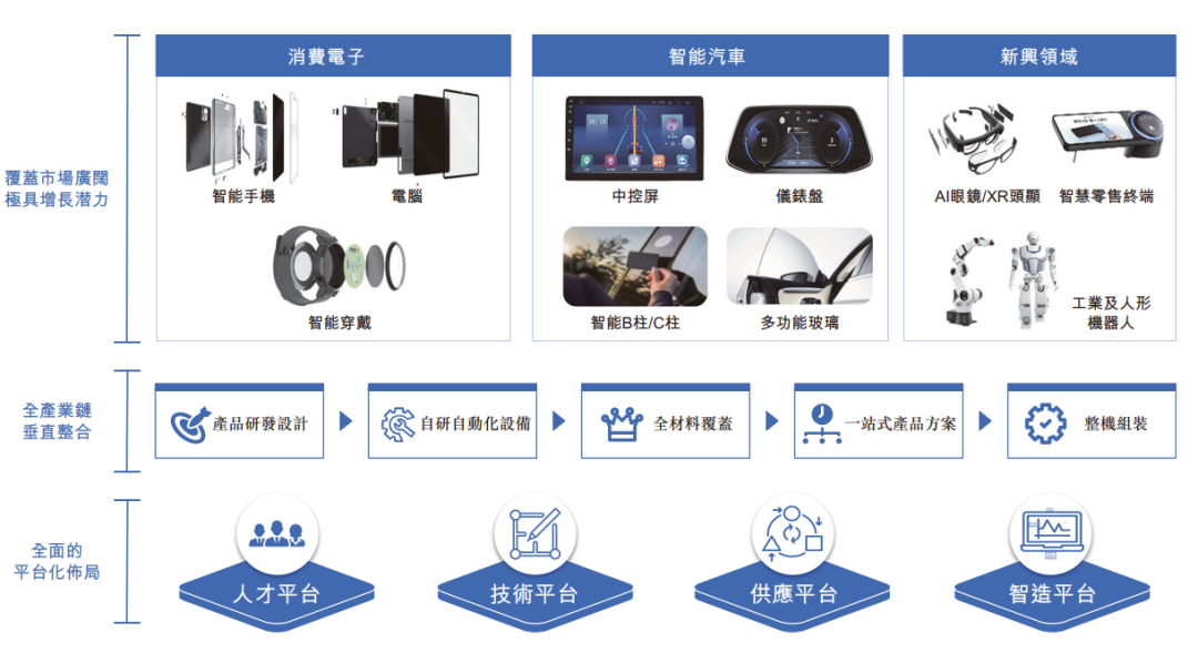 智能汽车:蓝思科技围绕智能驾驶舱研发及生产多样化的汽车电子和结构件产品,为客户主动提供创新的解决方案,包括中控屏和仪表盘等车载电子玻璃及组件、智能B柱╱C柱、应用于车窗、挡风及天幕的多功能玻璃等。