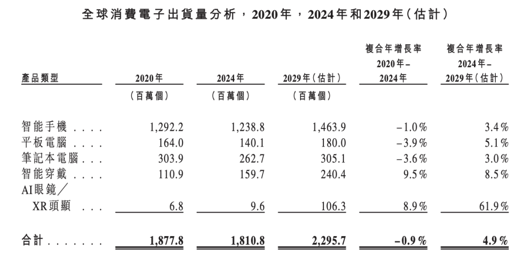 消费电子产品是指消费者日常生活中使用的智能电子产品,包括智能手机、平板电脑、笔记本电脑、智能穿戴以及AI眼镜╱XR头显,产品往往具备与用户触控交互、多媒体集成、软件生态协同的特性。2024年,全球消费电子产品合计出货量为约1,810.8百万个,其中全球智能手机出货量为1,238.8百万台。在AI眼镜的强劲需求推动下,2024年全球AI眼镜出货量同比大幅增长超200%,突破2百万副。预计未来创新型的消费电子产品设计及与AI的融合应用将助推消费电子产品的更新迭代。